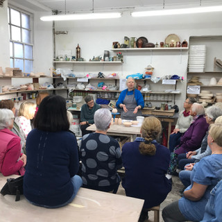 On Sunday 20th October Heather Gilbert, pottery tutor at the club, demonstrated how best to use Kirkcaldy Art Club's own glazes. Heather gave members an insight to the endless possibilities from the large selection of glazes available at Kirkcaldy Art Club. She showed members different ways to apply glazes, what problems to look out for, how to use wax resist, and also 'what not to do' , reminding potters to 'Clean the bottom of your pot !!' Heather had prepared some beautiful examples. Members left feeling inspired, even those who had been coming to classes for years. We look forward to seeing the examples emerging from the kiln.
